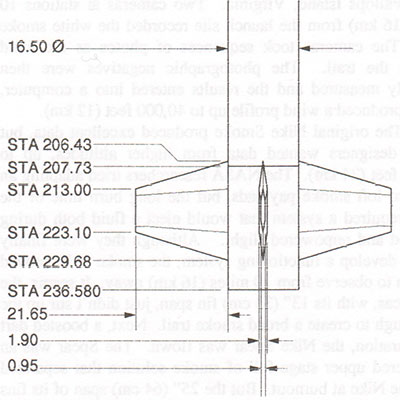Above is a close-up of the drawing from Rockets of the World, p. 164, showing the dimensions for an actual Nike fin (from the Nike-Smoke drawings). To scale our fin to standard 3.9" I.D. tubing (4.03" O.D.), plus a through-the-wall tab to a 3" MMT: