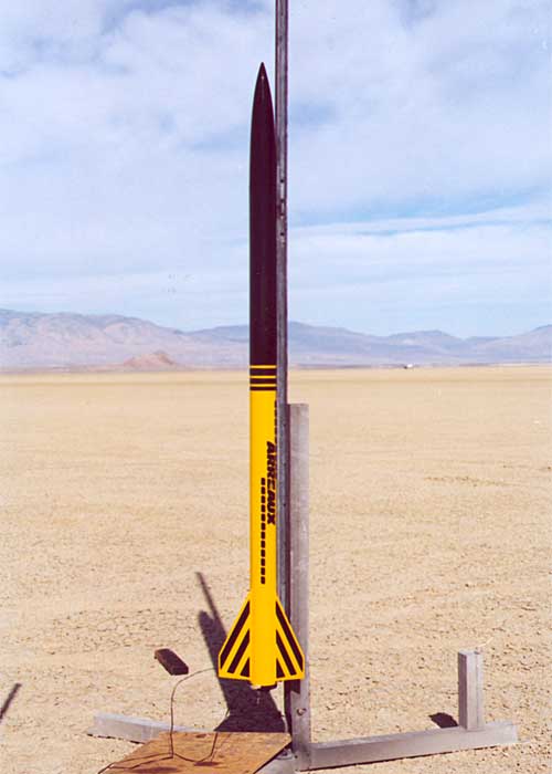 The next step in the sequence was a three-grain 98mm motor to be launched at the AERO-PAC Black Rock XII launch on September 10, 2000. Despite urgings to fly it on the blue thunder M2400, I decided to stick with the original plan and fly it on the gentler white lightning M1419.