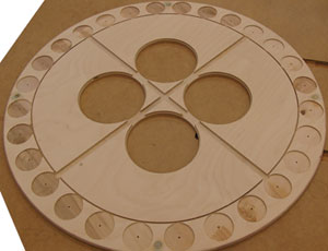 The start of building was to create a quarter-section plug out of wood. First two pieces of ¾" plywood were joined at a 90° angle to create the flat edges of the quarter slice. Then quarter-circular ribs and curved-top rectangular stringers were cut out of ¼" plywood and built inside.