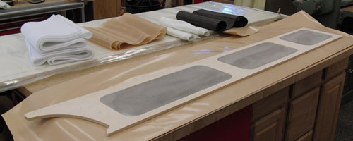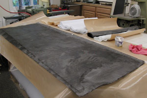 Here are the components ready for lamination, from right to left (in order of application): 5.7oz carbon fiber for stiffness, 4oz fiberglass veil, release film and breather.