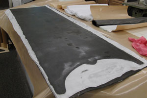 Once the cloth is stuck down and smoothed out, I brush on more epoxy to fully wet it out. It's important to have no dry spots, and excess epoxy will be removed by vacuum bagging. |