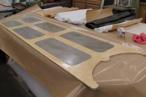 My wife Renée took the pictures above of me laying up the fiberglass. This was a pretty easy layup since it's a large piece and the fiberglass tape is easy to work with.