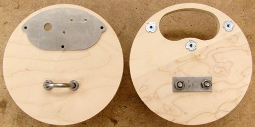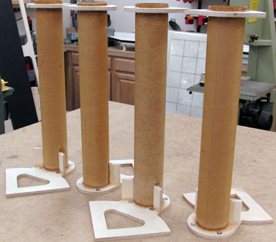 These plywood bulkheads mount into the bottoms of the four parachute cannon, which allows me to use any number of parachutes from one to four, and even a combination. (My preliminary plan is to to deploy one at apogee and a second of the same size at a lower altitude.)