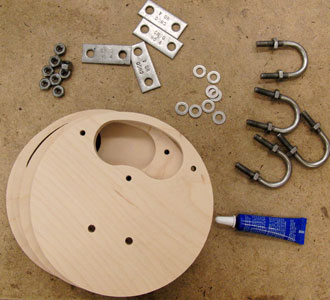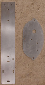 Above left you can see the parts for the bottom, which is a standard HPR bulkhead assembly, other than the kidney-shaped cutout for the electronics mount. Above right you can see the two main pieces of the mount. The oval place mounts over the cutout in the bottom and the rectangular piece hangs down from it. (They join with a custom cut piece of aluminum angle, not shown.)
