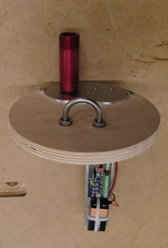 Here is how the electronics bay works in the nose section. An Adept ALTS25 is mounted to the electronics bay cover plate. wires to arm the ALTS25 are run out through one of the side vents and the electric match wires are run out through the plate. The picture on the right shows the nose section ready to attach to the bridle.