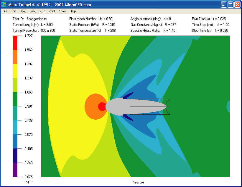 The program is designed for airfoil cross-sections and thus you can't model fins or any other 3-dimensional shapes. I entered the nose and tail sections into the program and ran the simulation. The display you see below shows the pressure flowing over the rocket body. I also overlaid the outline of the fins on the chart for reference. (Click on the graphic for the full chart with axes and summary info.)