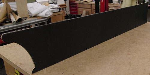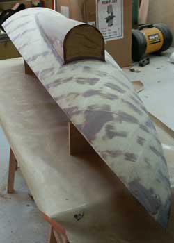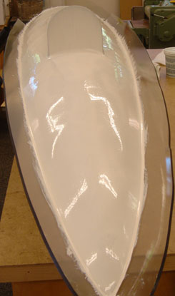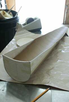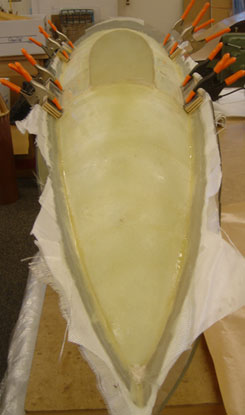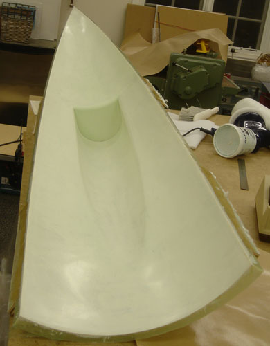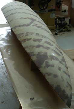 Finally, two layers of 9oz. fiberglass tape (6" at the large radius and 4" toward the tip) were applied to create a hard surface and give some body for sanding and smoothing.