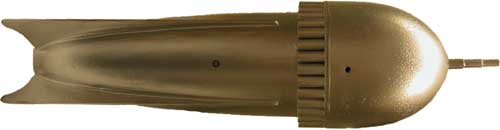 The measured C.G. was 10¼" from the cannon tip (7¾" from the tip of the nose). My estimated C.P. was 13½" (11" from nose tip), giving about ½ caliber of stability. (See the Design section below for more on this.)