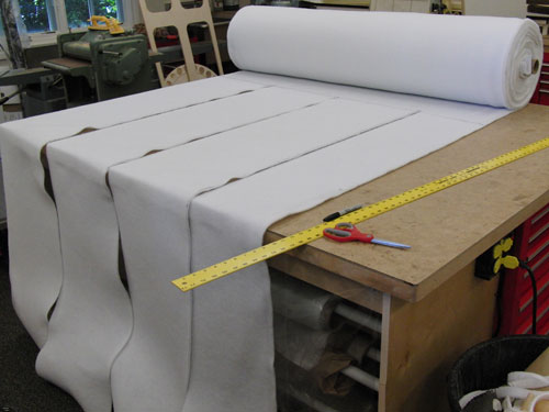 The release and breather were cut to 16" x 82" to comfortably cover the widest and longest dimensions of the "small" fin core. My big worktable isn't large enough to cut the pieces off the breather roll in one go!