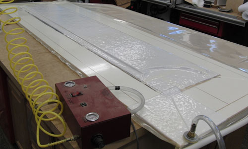 It even took a lot of epoxy to wet out the part and the four layers of reinforcement (two each side), but finally the part was in the vacuum bag. (I'm actualy using a veneer press for this large part and to make sure it cures absolutely flat.)