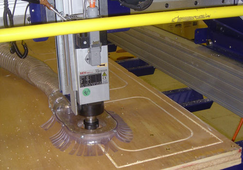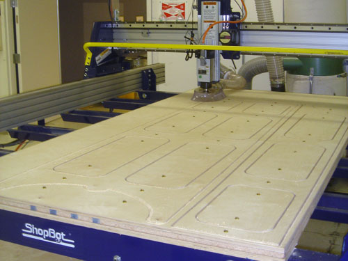 I have a membership at the TechShop, so the obvious way to cut these plywood fins was on the ShopBot CNC router. Below you can see a close-up during the cutting of one of the half pieces.