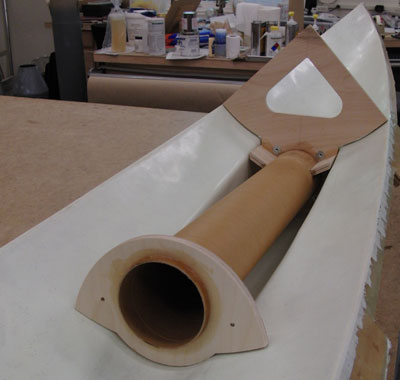 Above you can see one of the MMT assemblies placed in the mold. When the body shells are laid up, this piece will not only anchor the MMT to the body, but it also provides a bracket which will bond to the inside of the fin structure.