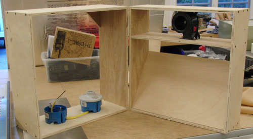 In the picture above, you can see the 20" square oven ends. The one on the left has two light sockets for the heat lapmps. The one on the right has a 110VAC electric fan to circulate the air through the box.