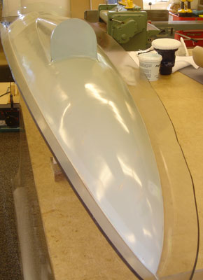 Once the plug was ready, I applied a gel coat layer. In this case, I just used thickened epoxy with a coloring agent added. Once the gel coat had partially hardened, I applied the fiberglass cloth over it, starting with 4oz. and working up to 10oz. Because of the complex shape, I had to use pieces about 12" square and overlap them in various ways. The part around the engine nacelle required particular care.