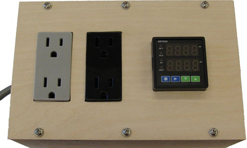 Above is the completed box, with the controller on the right, a switched outlet (black) in the center, and an unswitched outlet (gray) on the left. The switched outlet will be for the heat lamps and the unswitched outlet for the circulation fan.