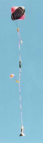 The Magnum flew twice more at ROC-stock in June 2000. For the first flight, I wanted to try out the AeroTech hybrids and decided to fly a K485 turbo hybrid. (This is a hybrid using white lightning grains instead of paper.) It was windy all weekend and the extra impulse would be good to get this large rocket going quickly.