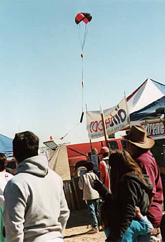 There was almost no wind on Sunday morning when I launched and the Magnum landed right back at the flight line. In fact, it landed in vendor row! The coolest shots I got were the two above, showing the rocket hanging perfectly with both 'chutes deployed and just landing. That's a picture-perfect demonstration of dual deployment! (The Magnum landed on a truck and neither the truck nor the rocket were damaged.)
