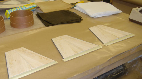 Once the profiles were formed, it was a simple matter to bond them to the cores. The faces of the cores were first sanded, then I painted a thin layer of laminating epoxy onto the balsa profiles and taped them in place on the cores.