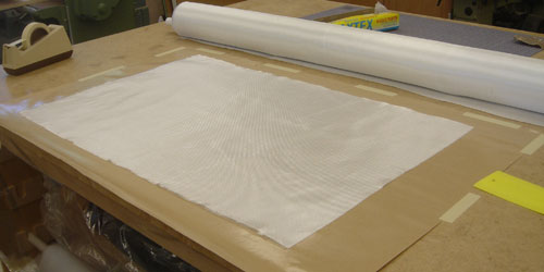 "The" secret to working with composites is to keep things clean and be prepared before you mix the epoxy. Below you can see the cloth laid out in preparation for wetting out. I've used paper to protect my work surface and taped it down securely in the back and on the sides. (This paper is a key part of the rolling process as described below.)