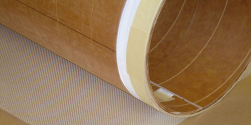 Place the tube onto the cloth so that the line on the tube hits the front edge of the cloth. Lift the front edge of the paper up and roll back a little, smoothing the cloth onto the tube through the paper. Once the cloth edge is up about 90° from the table, carefully peel back the paper and smooth down the cloth. (Be careful with the cloth at this point since the cut edge is fragile.)