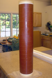 Now, grasp the end caps and rotate the tube away from you while pulling the whole thing toward you. This will cause the cloth to stretch more around the tube circumference due to the friction between the wet cloth and the paper on the table. (Remember that we taped the paper down to the table.) Rotate/pull about 1/8 of a turn then do another round of smoothing/streching out to the sides. Keep rotating/pulling and smoothing/streching until the entire tube is wrapped. Et voilá, a perfect lamination!