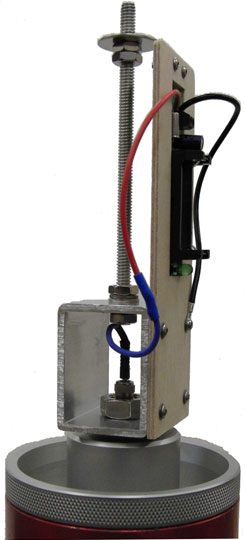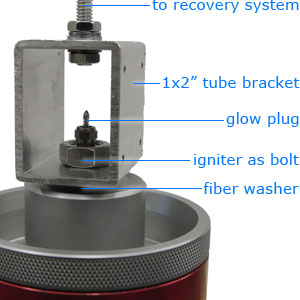 Here is a side view showing how the EFC is mounted and connected to the glow plug. On the right is the sustainer airframe slid down onto the motor/closure/mount and secured with an eye bolt. Retention is positive and the weight of the motor is transferred to the parachute bridle through aluminum threaded rod to the bracket and to the forward closure.