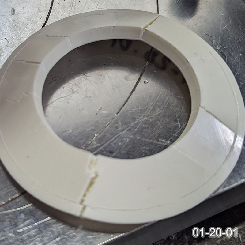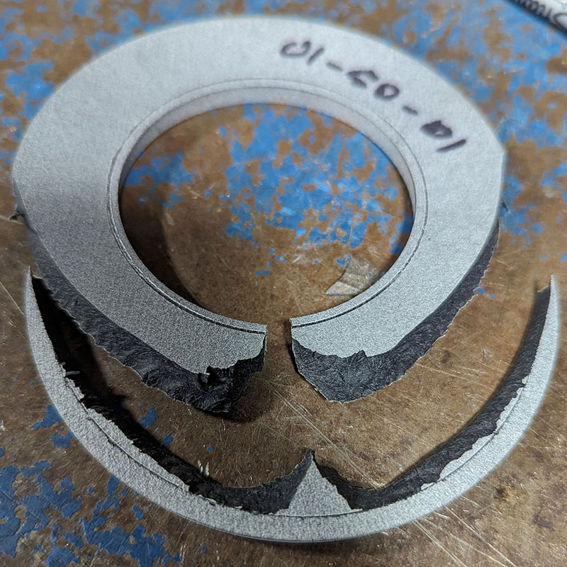 What really surprised me is how important the number of "wall loops" is. This is the thickness of the outer sides of the part, and clearly it has a big impact on the shear strength of a centering ring. We're getting there: ABS with 50% gyroid and 8 wall loops broke at an average of 692 lbf, 90% as strong as plywood of the aame shape. See the raw data at the bottom. (Beyond that, we're just making a pretty much solid part, especially for a CR.)