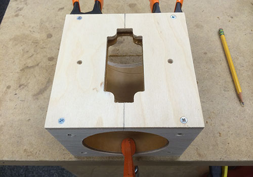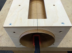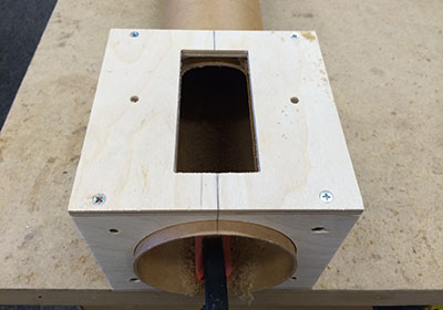 To use the box jig, just mount the tube firmly through the ends. Here you can see me using a bar clamp in front to hold the tube and jig to the work table, and two spring clamps in back to hold the tube to the jig. If the tube is tightly held, you won't have any shifting or chattering during routing.