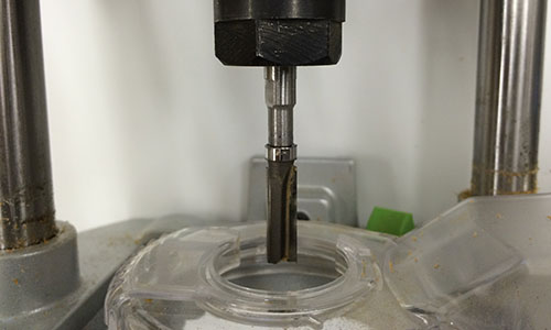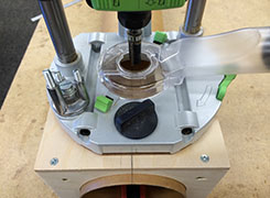 The most commonly available cutter diameter for pattern bits (like flush trim bits) is ½", but smaller sizes are available. In the photo above, I've mounted an Amana #47224 bit with a ¼" cutter diameter to get smaller corner radii when cutting out the inside of the mount. The tubing cutout and cover are routed with a more standard ½" pattern bit. Note that you should pick a bit with a long enough cutter length to cut through the tube as it moves away from the center.
