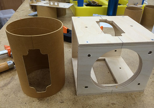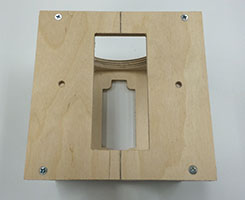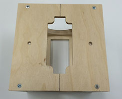 The cutout jig is a box with open sides. The top and bottom have holes designed to guide a pattern bit. The top is for the cover mount, and the bottom is for the airframe cutout. The ends have a hole sized for the airframe tubing to fit into snugly.