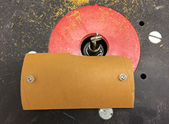 Now, with the cover material firmly mounted to the jig, use a pattern bit mounted in a router table to trim the cover to the same size as the pattern block. I wear heavy leather gloves and am very careful with my hands so near the router bit. Also make sure to observe the direction the bit spins and avoid climb cutting.