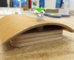 The cover jig is a simple piece of plywood, cut so that its corners are the same radius as the pattern bit used for the airframe cutout (½" diameter here). The oversized tubing scrap is placed on the block, screwed down with the mounting screws for the electronics, and then routed to shape using a pattern bit in a router table.