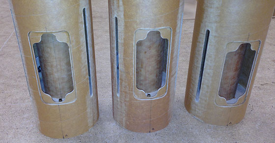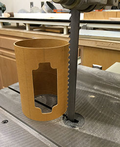 After pattern routing, the cover will exactly match the block, and the angle of cut of the edges will also be perpendicular to the tangent of the tube at the center line, just like the airframe cutout. (The routing is always done along a plane tangent to the tube.)